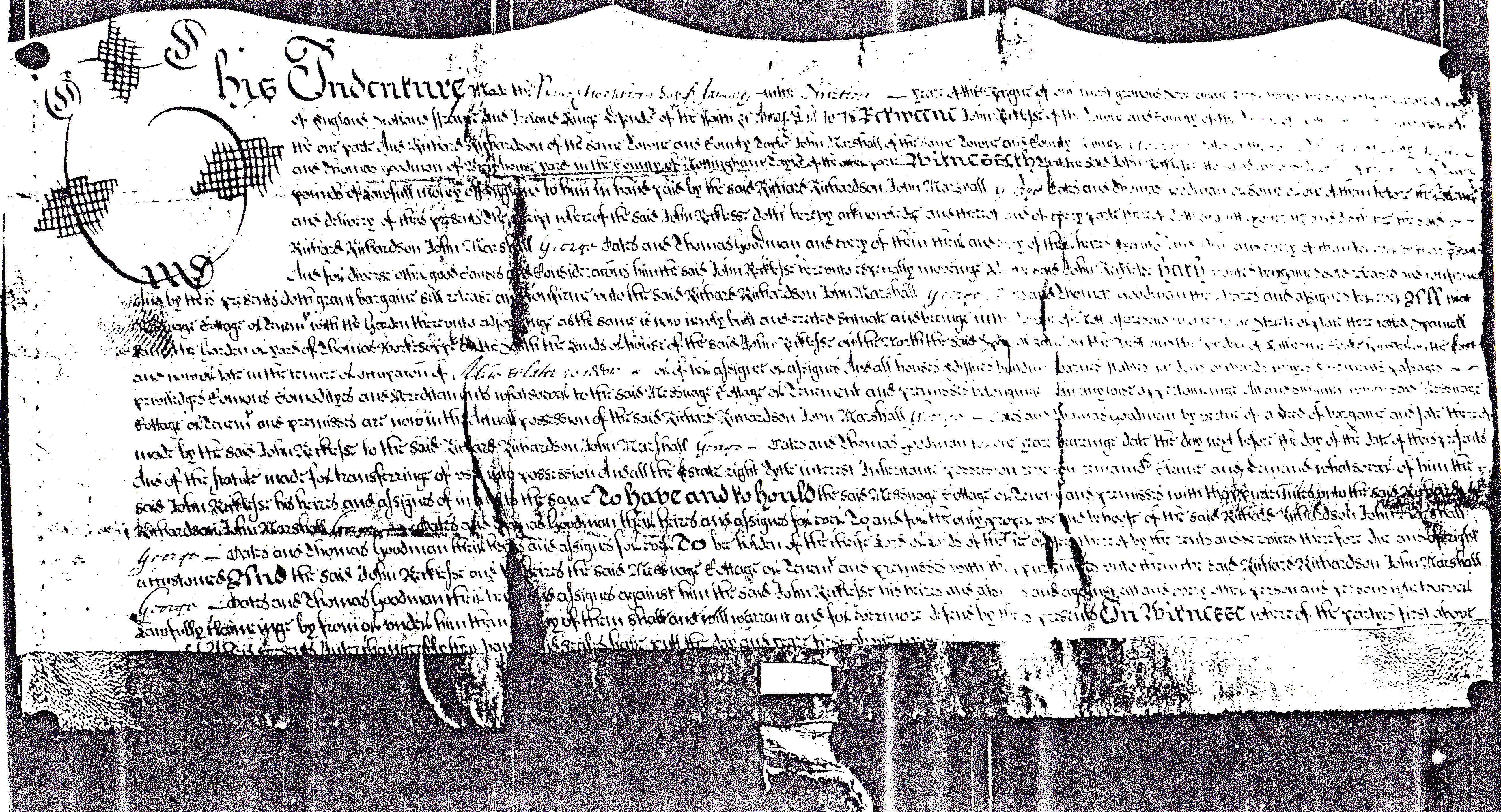 Indenture for the sale of a new house and garden in Spaniel Lane (now Spaniel Row) from John Reckless to Friends for £10.